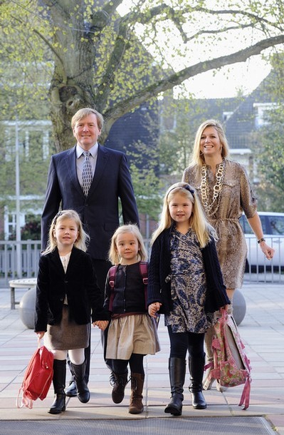 Dutch Prince Willem-Alexander (TOp C) and Princess Maxima (3R), Princess Alexia (L), Princess Amalia (3L), teacher Carla Buijs (2R) and teacher Yvonne van Veen (R) accompany Dutch Princess Ariane (C) on her first school day at the Bloemcampschool in Wassenaar April 11, 2011.