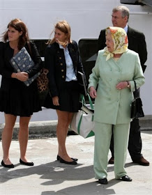 Britain's Queen Elizabeth II waits with her son Prince Andrew, and granddaughters Princess Eugenie, left, and Princess Beatrice, before boarding the yacht 'Hebridean Princess' in Stornoway, Scotland, Friday July 23, 2010, with other members of the Royal family, at the start of a holiday sailing around the Western Isles of Scotland.Photos Daylife.
