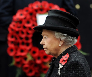 Britain's Queen Elizabeth II prepares to lay a wreath during the Remembrance Sunday service in Whitehall, London, on November 14, 2010. It marks the armistice to end the First World War.