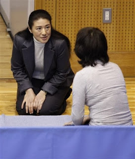 Japan's Crown Prince Naruhito (L) and Crown Princess Masako (R) talk with evacuees from the March 11 earthquake and tsunami at a gymnasium, currently an evacuation center, inside Ajinomoto stadium in Chofu, western Tokyo April 6, 2011. The couple visited the evacuation center to encourage the evacuees, who are mainly from Fukushima prefecture.
