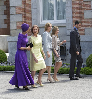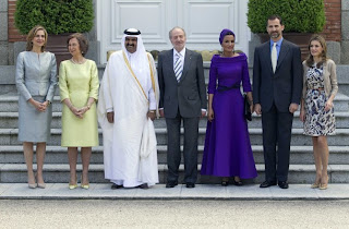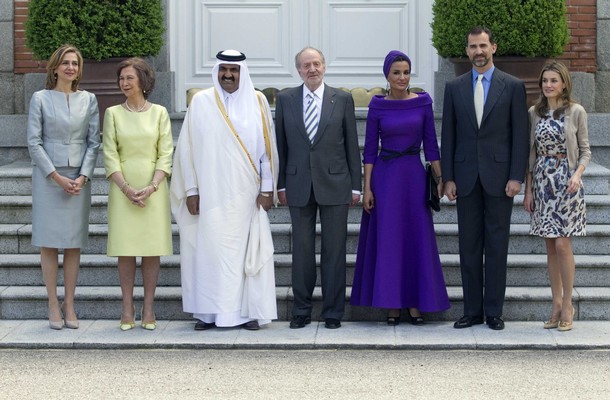 MADRID, SPAIN - APRIL 25:(L-R) Spanish Infanta Cristina , Spanish Queen Sofia, Qatar's Emir Sheikh Hamad bin Khalifa al-Thani, Spanish King Juan Carlos, Qatar's Sheikha Mozah Bint Nasser al-Missned, Spanish Crown Prince Felipe and Spain's Princess Letizia pose before a private lunch at Zarzuela palace in Madrid April 25, 2011. Qatar's Emir Sheikh Hamad bin Khalifa al-Thani and his wife Sheikha Mozah Bint Nasser al-Missned are in Spain on official visit.