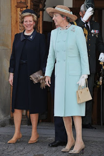 Queen Anne-Marie of Greece and Princess Benedikte of Denmark depart after the christening of Crown Prince Frederik 's twins at Holmens Kirke on April 14, 2011 in Copenhagen, Denmark.