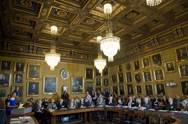The 2004 Nobel Prize Laureate in Physics David Gross (L) applauds next to Swedish Crown Princes Victoria at The Royal Swedish Academy of Sciences during the opening of the third Nobel Laureate Symposium on Global Sustainability in Stockholm on May 17, 2011.