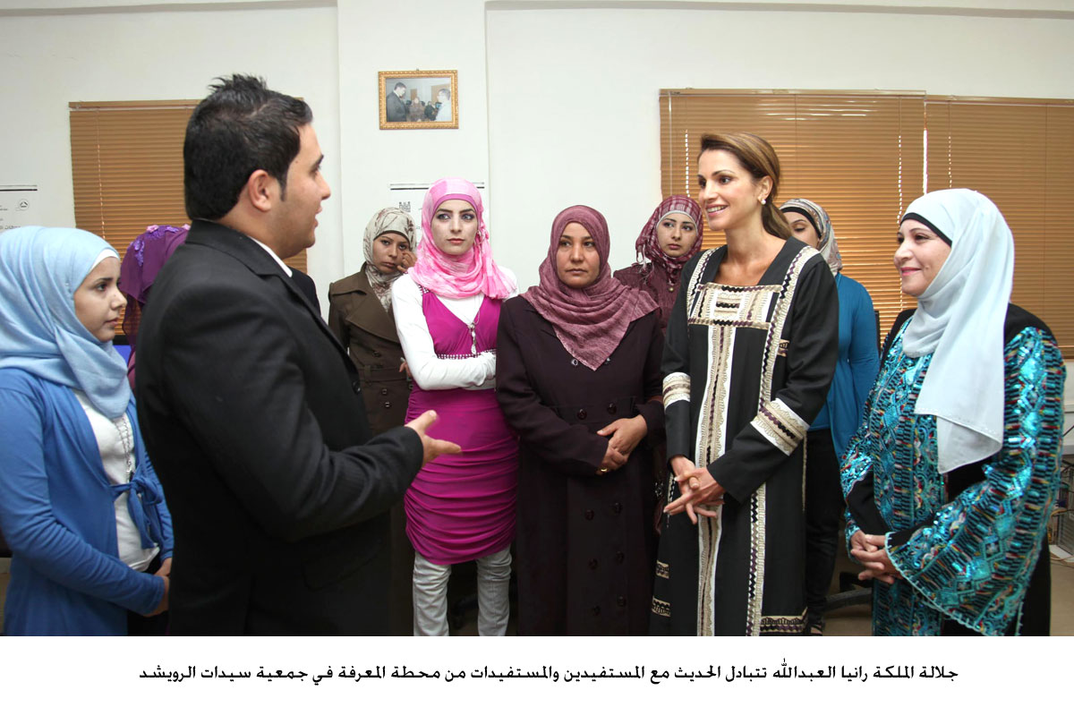 Jordan's Queen Rania (R) speaks to school children during her visit to Ruweished May 2, 2011. Queen Rania also inaugurated the municipal library and toured the headquarters of the Ruweished Association for Women during the visit, Jordan's News Agency Petra reported.