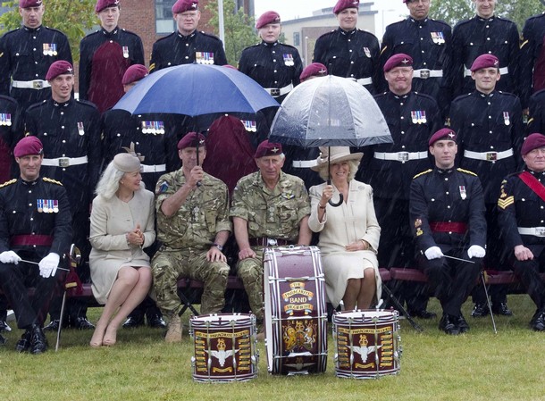 Camilla, Duchess of Cornwall shelters under an umbrella as it starts to rain as she and Prince Charles, Prince of Wales pose for a group photo with members of the Parachute Regiment after presenting them with campaign medals, at Merville Barracks, June 16, 2011 in Colchester, United Kingdom.