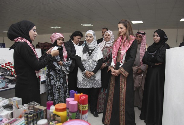 Jordan's Queen Rania (3rd R) speaks with Bedouin women during her visit to Maan City in southern Jordan, June 1, 2011. Queen Rania on Wednesday made a visit to Maan, where she checked up on the Jordan River Foundation (JRF) work in the area and inspected the local youth center, Jordan's News Agency said.