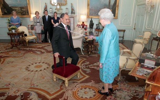 Sir Jerry Mateparae, Governor-General Designate of New Zealand, is Knighted by Queen Elizabeth II at Buckingham Palace on June 1, 2011 in London, United Kingdom. Sir Jerry has been appointed as Additional Knight Grand Companion of the New Zealand Order of Merit and will be sworn in as Governer-General on August 31.
