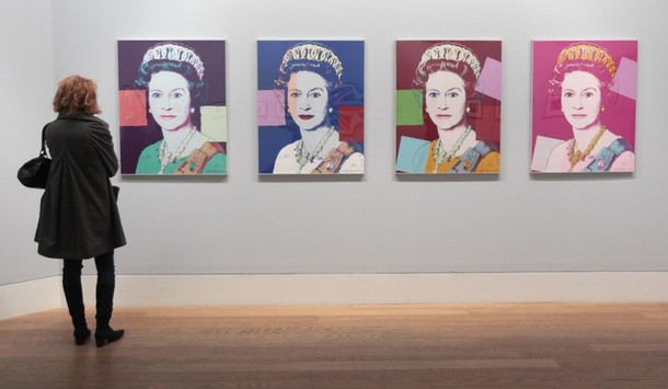 A woman looks at silkscreen prints by Andy Warhol of Britain's Queen Elizabeth during a press view of The Queen:Art and Image exhibtion, in the Scottish National Gallery in Edinburgh, Scotland June 23, 2011.